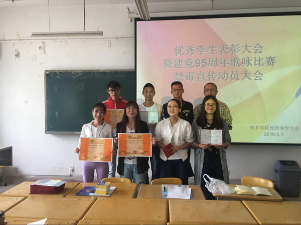 2016年6月1日中午,美术学院学工办、分团委、学生会,在1-704召开优秀学生表彰大会暨建党95周年歌咏比赛、禁毒宣传动员大会。会议由学院辅导员分团委书记匡扶老师主持,学生会全体成员以及2014级、2015级班委全体成员30多人参加了本次活动。