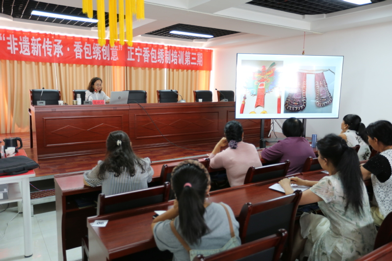 在推动中华优秀传统文化创造性转化、创新性发展的背景下,为进一步加强校地合作,促进非物质文化遗产的保护与传承,同时提升地方非遗产业的市场竞争力,8月19日-8月20日,美术与设计学院院长吴晓玲教授应邀为正宁县文化馆举办的第三期“非遗新传承·香包绣创意”培训活动进行授课指导,这期指导是以讲座的形式呈现,专题讲座从“形、色、质、意、趣”深入浅出地讲解了香包产品造型的重要性、造型配色技巧以及如何利用现代科技手段促进非遗文化的传播与创新。讲座内容丰富,既有理论深度,又具实践指导意义,在互动和交流中非遗传承人和学员们纷纷表示,系统的学习造型艺术对非遗产品创新更具有指导意义,让大家受益匪浅。