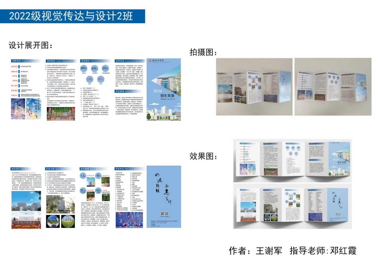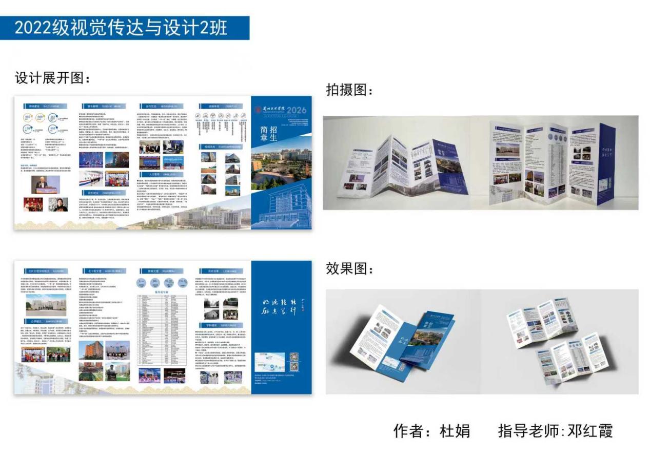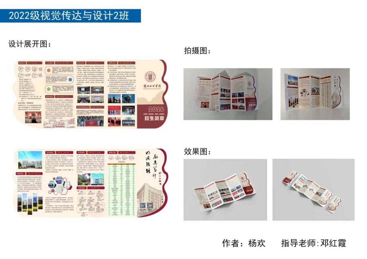 此次样本设计实训以“兰州文理学院招生宣传指南”为实训选题。学生们围绕这一主题,深入挖掘学校特色与优势,将学校的办学理念、专业设置、师资力量、校园环境以及丰富多彩的校园文化活动等元素巧妙融入样本设计中。在设计过程中,他们充分发挥视觉传达设计的专业能力,运用独特的创意、新颖的构图和鲜明的色彩搭配,精心打造出各具特色的招生宣传指南样本,力求以最直观、最具吸引力的方式展现兰州文理学院的魅力与风采。