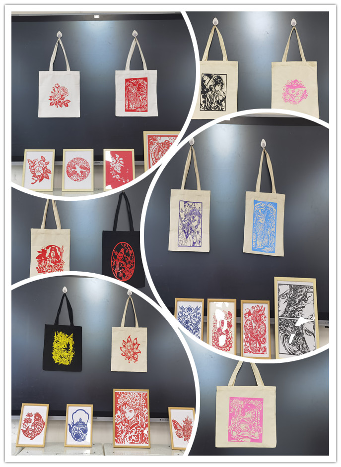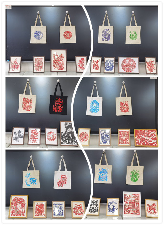 剪纸新材料的运用是课程的重要创新。同学们采用剪纸转印技术,将传统生肖、“喜鹊登梅”“福禄寿喜”、花鸟鱼虫等吉祥纹样及当代动漫元素,通过热转印工艺呈现于白色帆布包日常用品之上。这种创新,既是传统题材的现代表达,也是生活场景的艺术转化,兼顾教学严谨性与民间艺术本真性,展现非遗在青春视角下的创新活力。本次展览作品样式丰富多样,充分展示了我院学生扎实的专业功底,有力地促进了学院艺术氛围的良性互动。