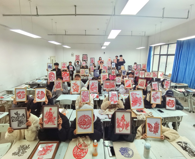 课程采用 “线上+线下"混合式教学法:线上依托智慧树慕课平台,构建立体理论体系;线下侧重剪纸实践教学,以刀剪为笔,带领学生在传统技艺中探寻文化根脉,在创新实践中焕发非遗活力。此次展出的300余件剪纸文创作品,正是教学成果的集中呈现。