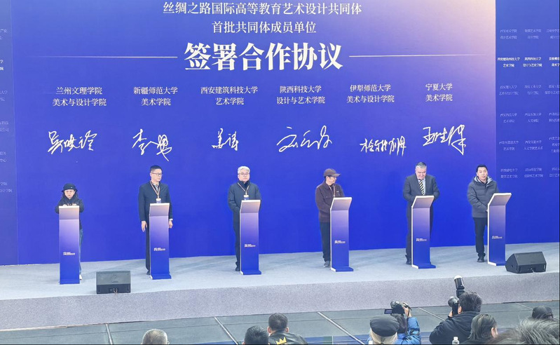 2025年12月28日,“第四届丝路精神——西部国际设计双年展暨丝绸之路国际高等教育艺术设计共同体”在西安大唐西市博物馆启幕。兰州文学院美术与设计学院院长吴晓玲、教师曹峻博应邀出席。开幕式上,吴晓玲代表学院与西安美术学院等48家高校、协会及企业共同签署共建协议,标志兰州文理学院美术与设计学院正式成为“丝绸之路国际高等教育艺术设计共同体”首批理事单位。