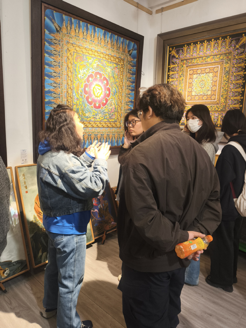 吕红娇老师结合绘画与工艺专业教学内容,现场为同学们讲解作品的构图逻辑、色彩体系与工艺细节,引导学生将课堂所学的造型、色彩理论与传统非遗工艺进行对照学习,深入理解传统工艺的创作逻辑与审美追求。同学们认真聆听、细致观摩,不时就工艺技法、创作思路与传承人、带队老师交流探讨,在沉浸式体验中感受传统工艺的匠心温度。