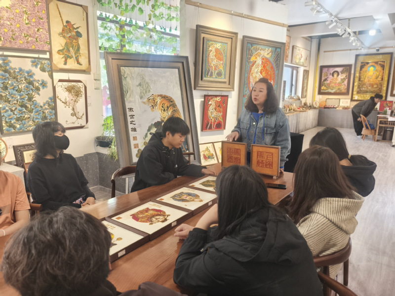 吕红娇老师结合绘画与工艺专业教学内容,现场为同学们讲解作品的构图逻辑、色彩体系与工艺细节,引导学生将课堂所学的造型、色彩理论与传统非遗工艺进行对照学习,深入理解传统工艺的创作逻辑与审美追求。同学们认真聆听、细致观摩,不时就工艺技法、创作思路与传承人、带队老师交流探讨,在沉浸式体验中感受传统工艺的匠心温度。
